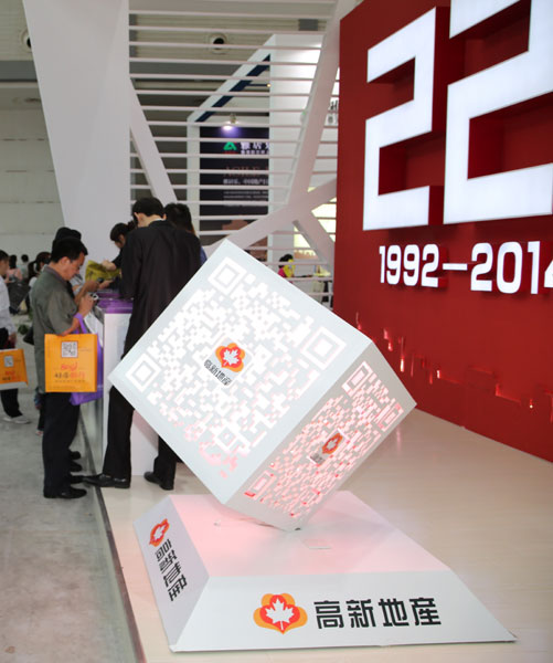 高新地产特别定制了七彩闪光模式立体的二维码模型,独特的造型、不断变换的绚烂七彩,作为西安住博会首创,标新立异的设计引得众人纷纷驻足拍照、扫描。
